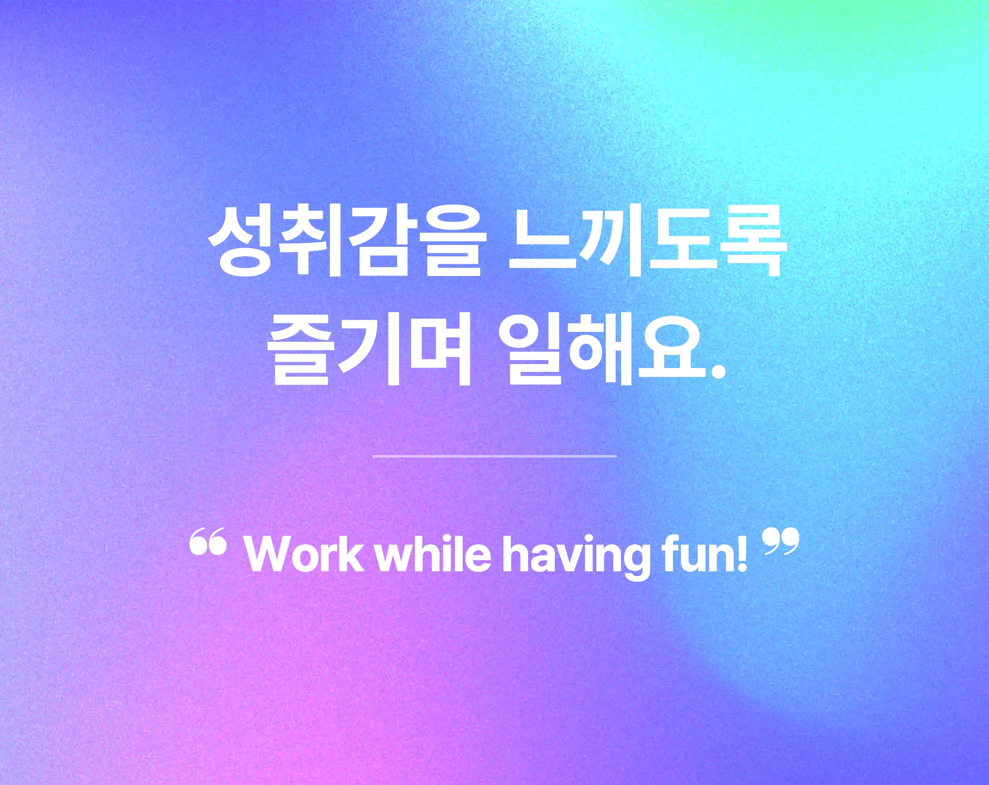일하는 과정에서 행복과 성취감을 중요시하며, 일과 삶의 균형을 추구합니다. 우리 조직에서는 열정과 함께 즐기면서 일하는 것이 높은 성과와 풍요로운 인생을 만든다고 믿습니다. 일터의 행복을 찾고 모두가 일하기 좋은 일터를 만들도록 노력하고 있습니다.