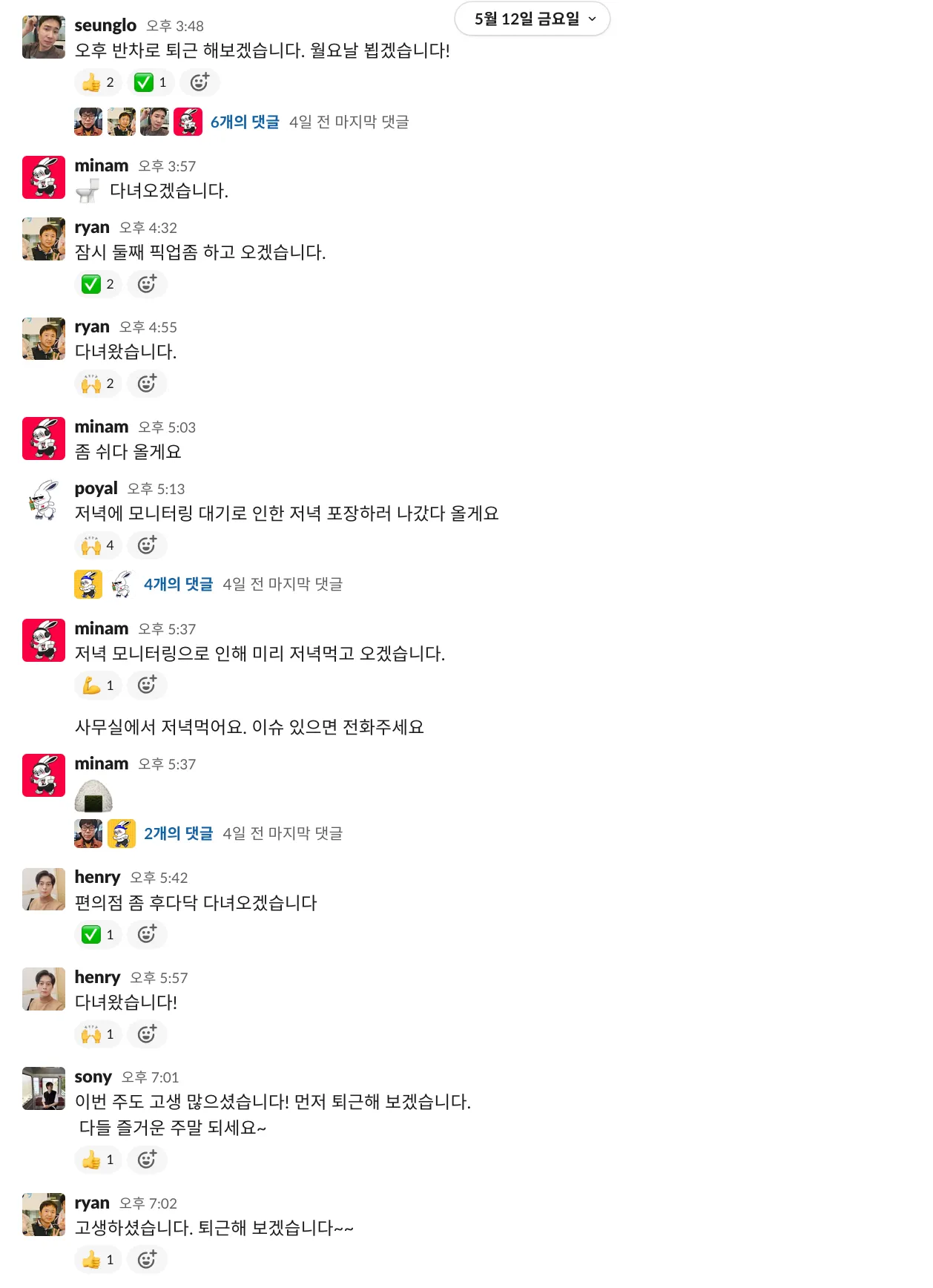 근무 또는 업무간 발생한 이슈사항이 있다면 팀 리더에게 공유합니다.
